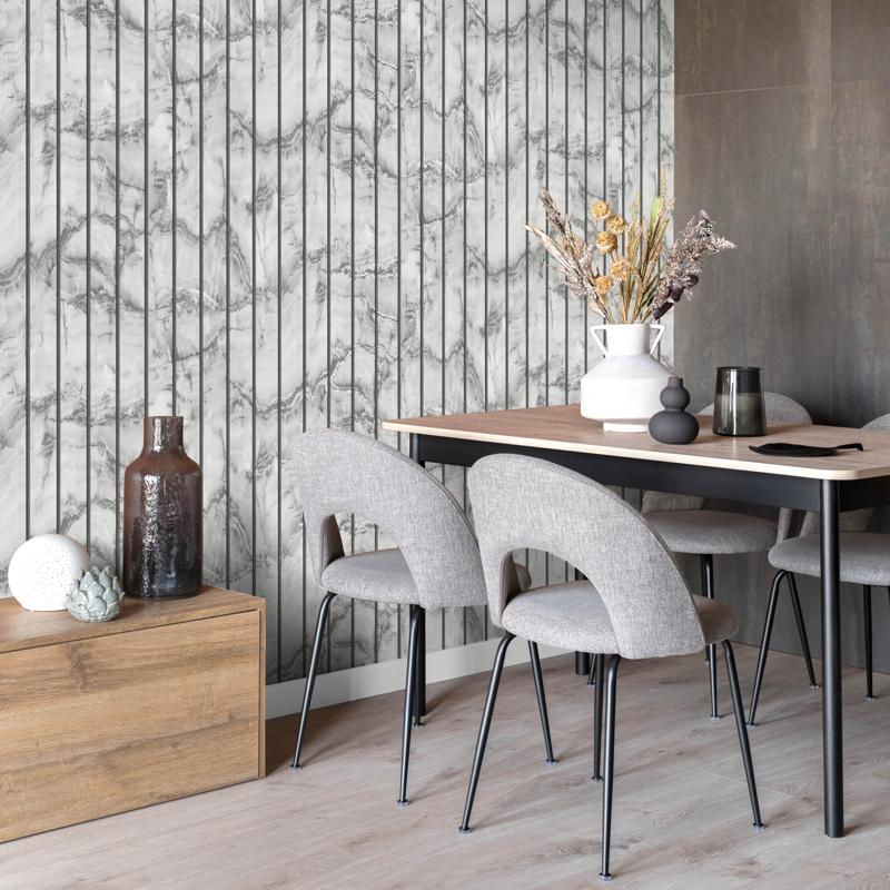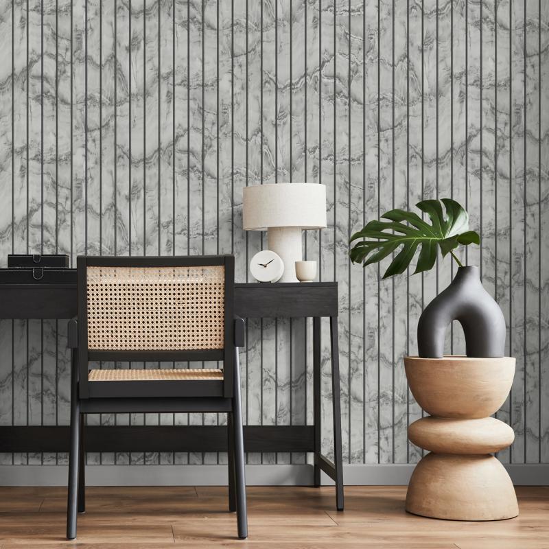 There’s a real nod here to Scandi minimalism and modern architectural interiors—clean lines, natural textures, and understated luxury. The marble effect adds movement and softness, while the slatted detail brings structure and rhythm. It’s the kind of grey marble wallpaper that works just as well behind a desk as it does in a dining room or hallway.