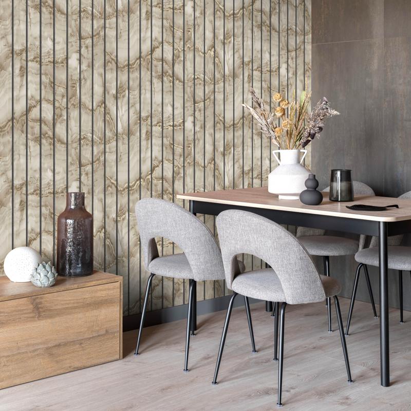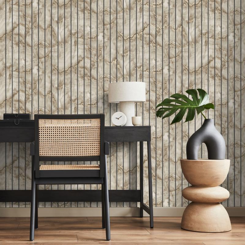 The colour palette is a dream for anyone who loves calm, contemporary interiors. You’ve got warm taupes, gentle greys, creamy beiges, and subtle hints of gold running through the marble effect. It’s a neutral marble wallpaper that doesn’t shout—but definitely gets noticed. The vertical slat design adds structure, while the organic marble pattern keeps things relaxed and natural.