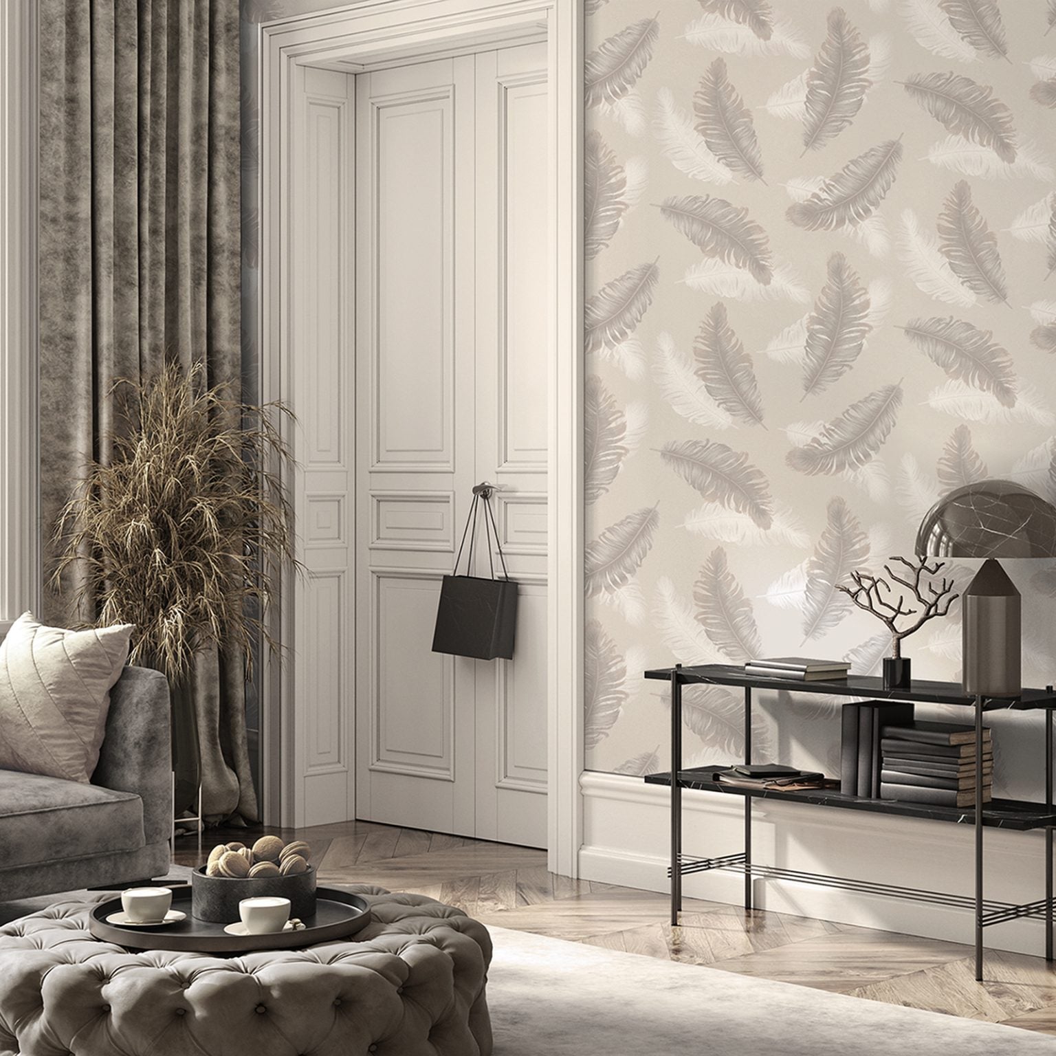 Moda Feather Beige Wallpaper works beautifully in living rooms, hallways, bedrooms and open-plan spaces. It’s especially suited to contemporary, Scandinavian-inspired and modern classic interiors. Pair it with warm oak flooring, boucle cushions and brass accents for a relaxed but polished look.