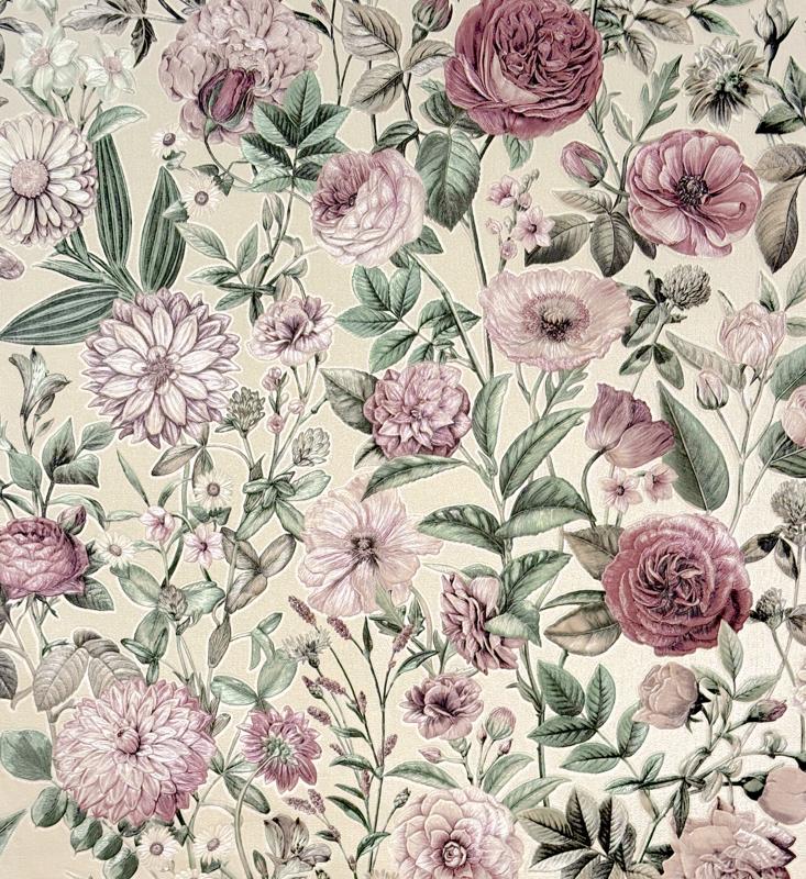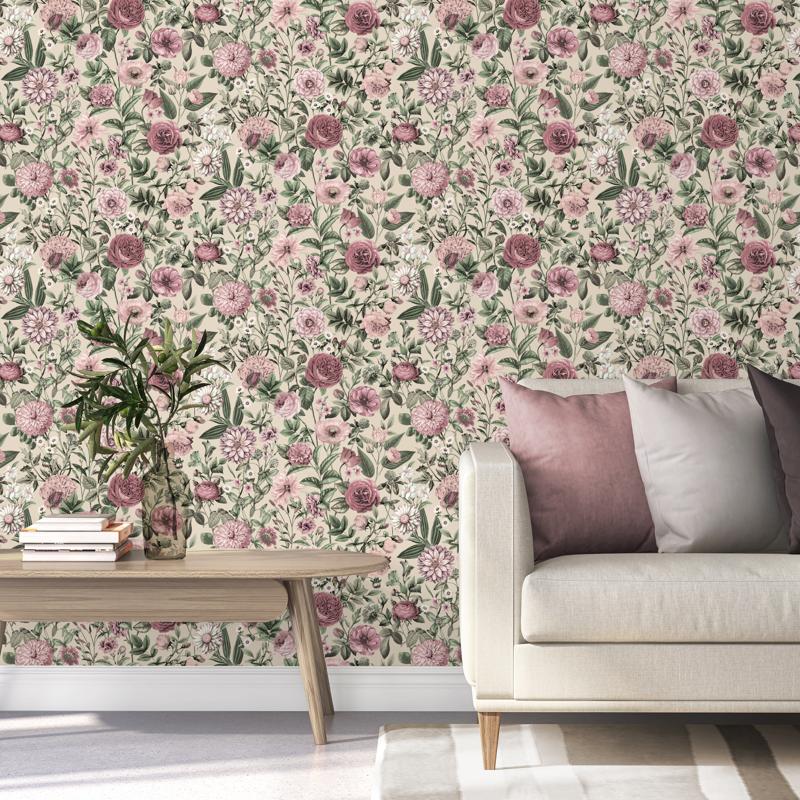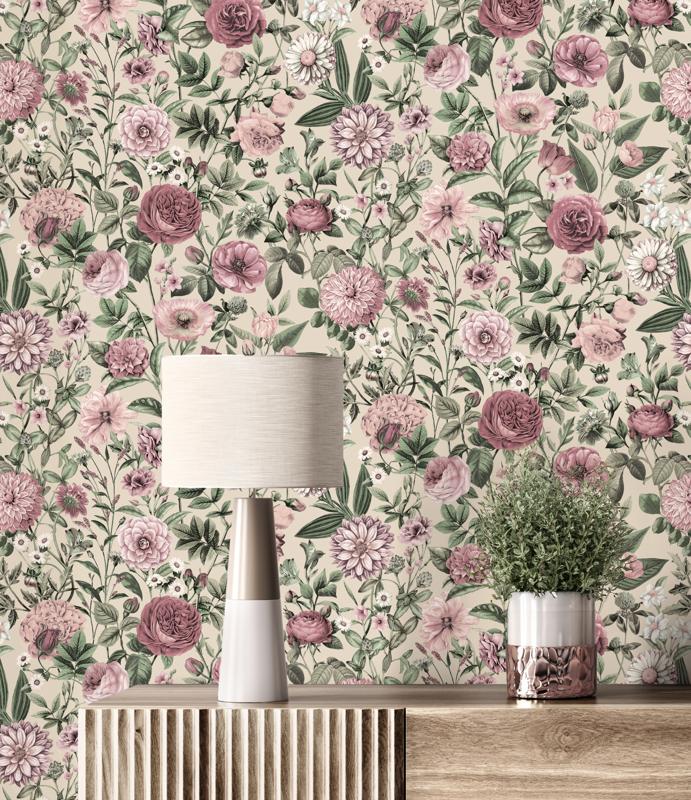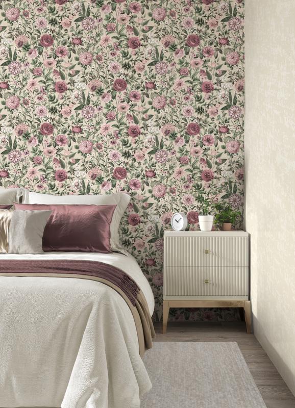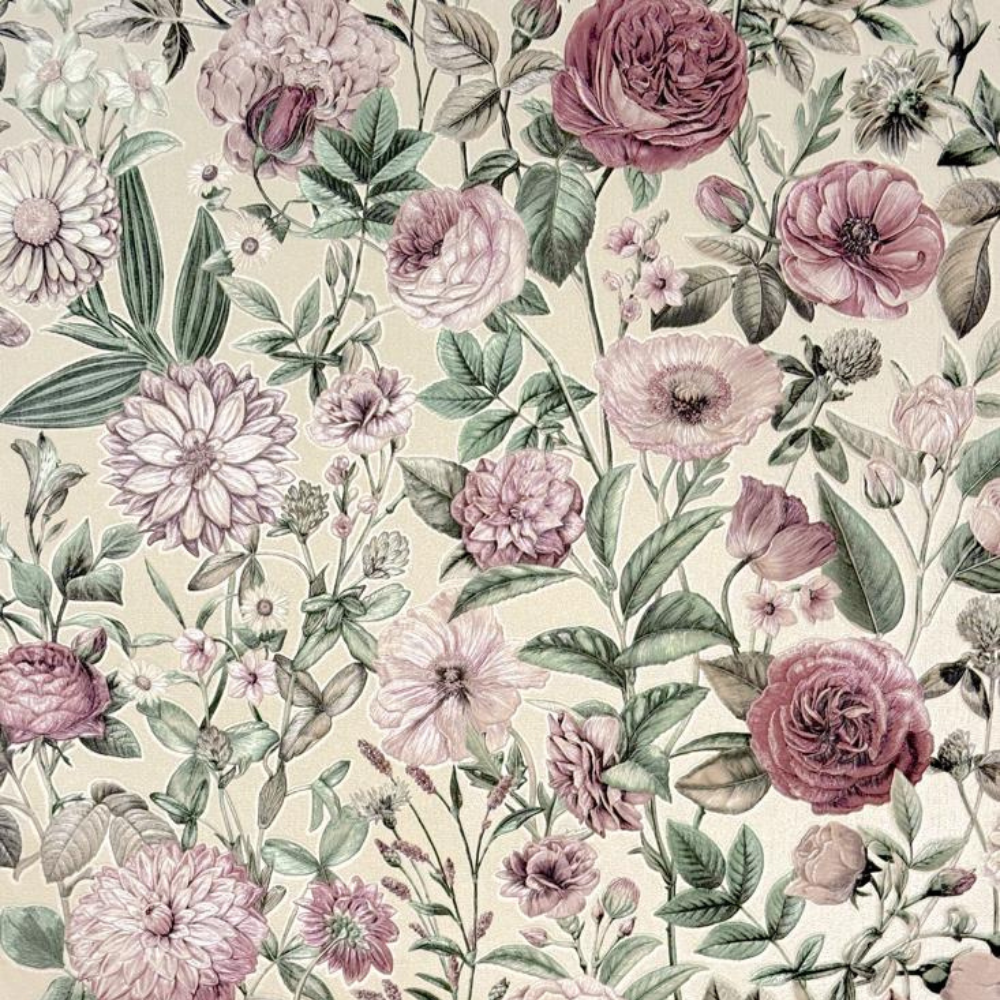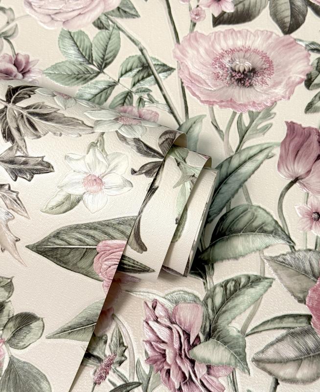 The colours here are beautifully understated. Think dusty pinks, soft blush tones, hints of mauve, and gentle sage greens, all layered over a creamy neutral base. The result? A light floral wallpaper that brightens a room without shouting for attention. It’s perfect if you’re after something calming but still full of character.