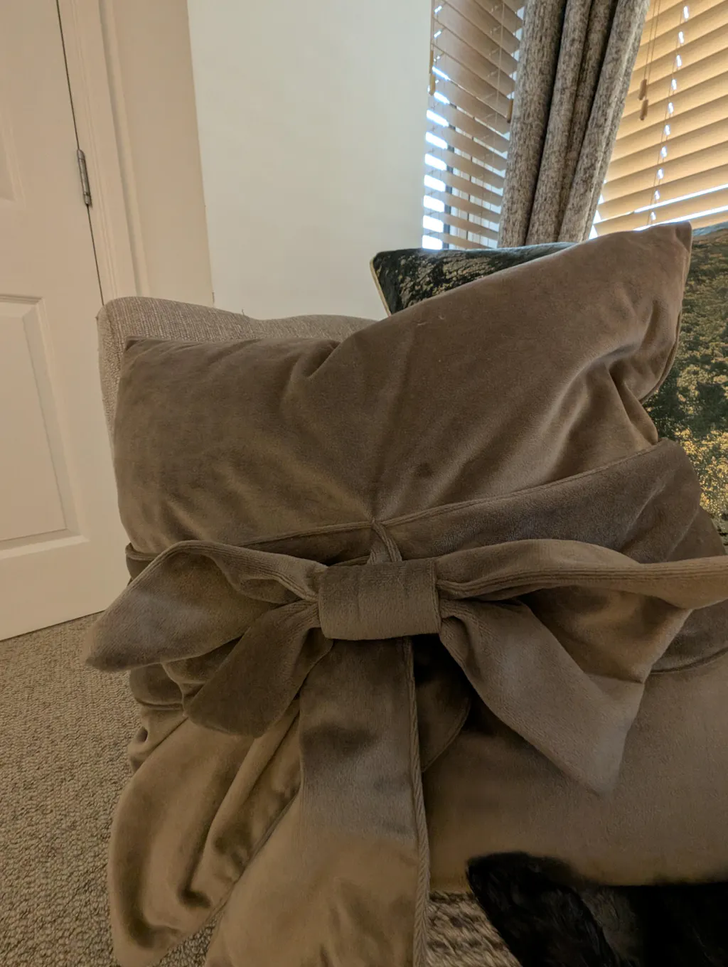 Wrapped in a calming taupe colour palette, this cushion offers a neutral base with a velvety finish that feels as good as it looks. Its show-stopping feature is the beautifully crafted oversized bow, draped across the front for a look that’s equal parts chic and charming. The warm taupe tones provide versatility, while the bow detail ensures this piece stands out from the crowd.