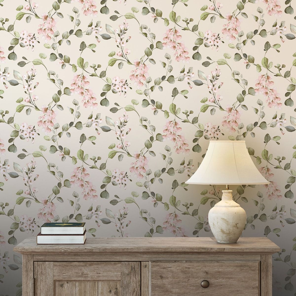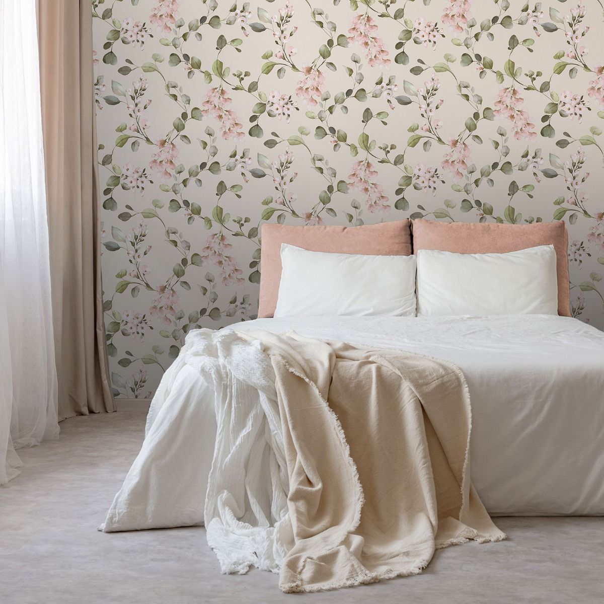 The colour palette blends creamy neutrals, dusty pink, soft rose and gentle eucalyptus green. The watercolour-style finish gives the flowers a hand-painted look, adding depth without overpowering the space. It’s feminine, yes – but in a calm, sophisticated way rather than sugary sweet.