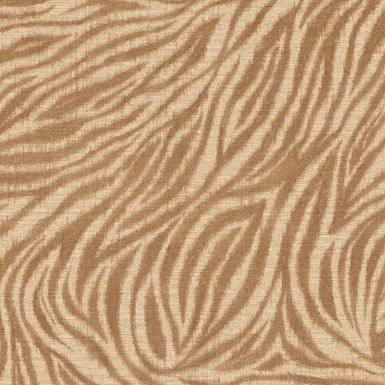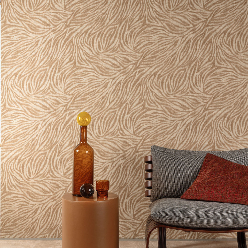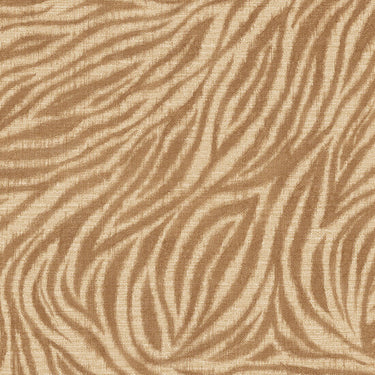The design features an abstract, almost leaf-like or zebra-inspired pattern, where softly curving lines ripple across the surface in a natural rhythm. The colour palette blends rust, caramel, warm sand and soft beige, creating a warm earthy look that feels both contemporary and timeless. The effect is textural and tactile, giving the impression of woven fabric or hand-crafted textile.