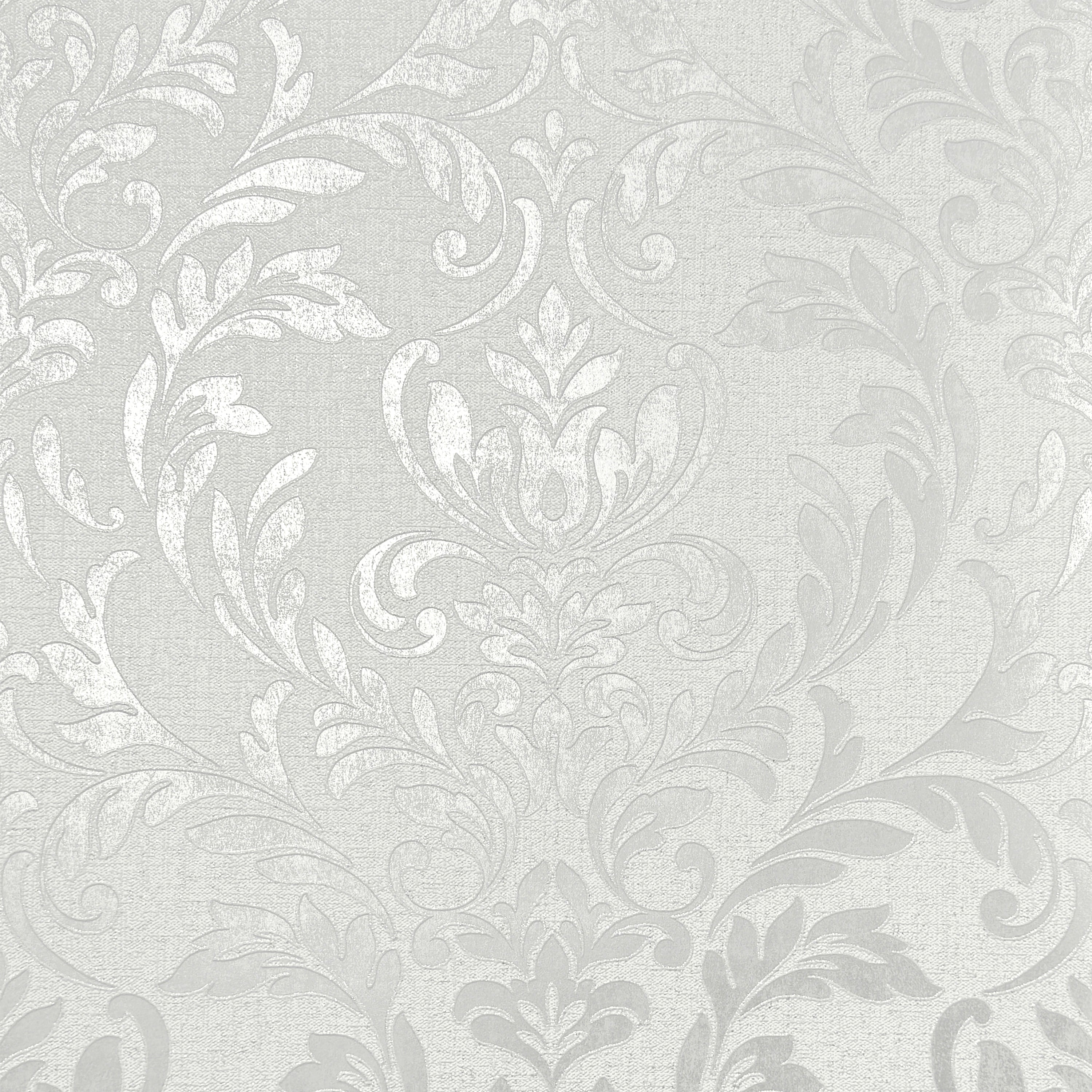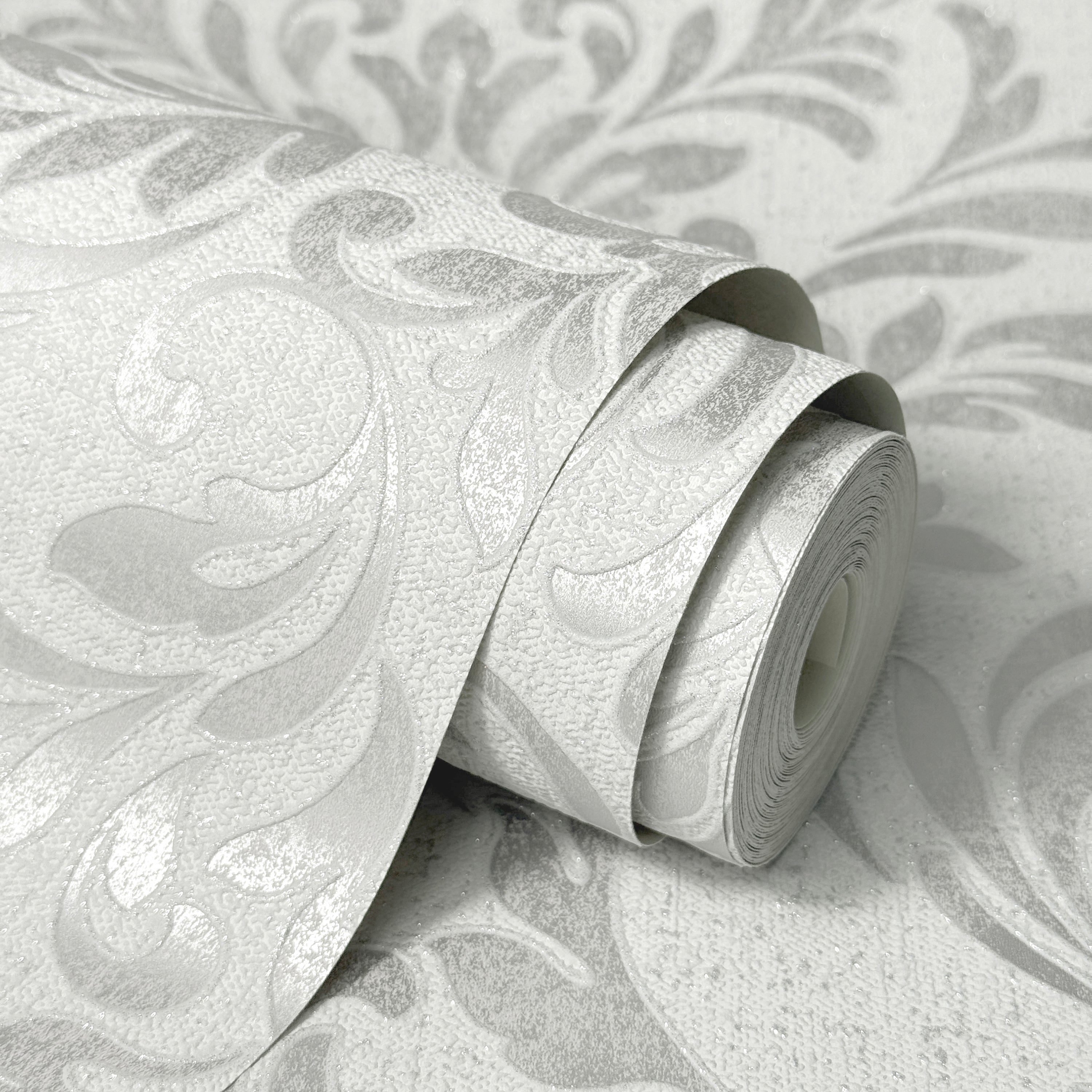 The large-scale damask pattern feels regal yet relaxed, with scrolling leaves and floral flourishes gently embossed into a heavyweight textured vinyl surface. The design catches the light beautifully, revealing a delicate pearlescent sheen that shifts as you move around the room. The pale grey palette works like a neutral, making it wonderfully easy to pair with everything from crisp white trims to darker, moody accents.