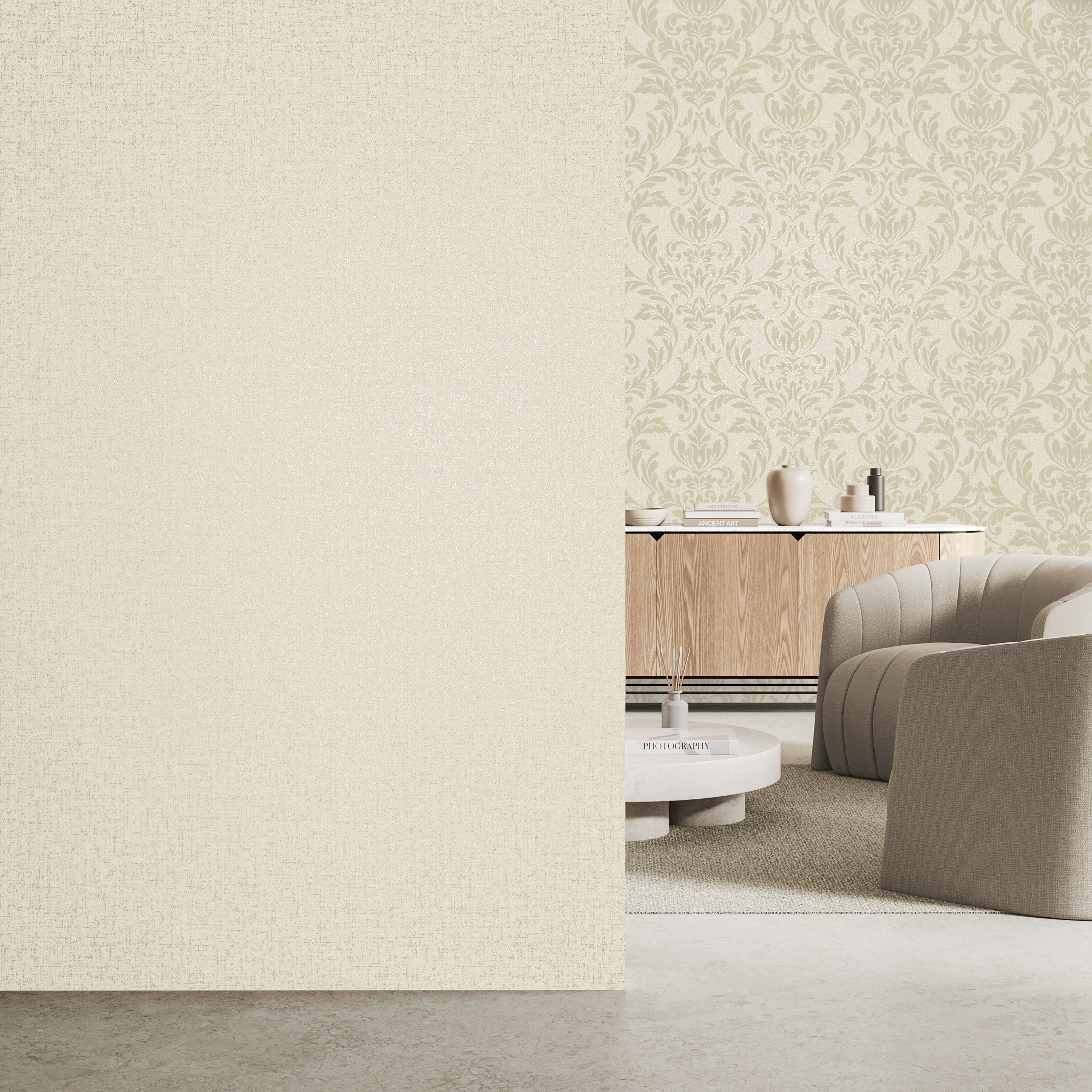 Whether you’re dreaming of a calm, Scandi-inspired bedroom, a cosy modern living room, or a sophisticated hallway, the Azara Plain Natural Wallpaper is your perfect base. It’s especially striking when paired with the Azara Damask Natural Wallpaper for a seamless mix of plain and patterned finishes. The soft tones blend effortlessly with both warm woods and cool metallics, making it a true chameleon in any interior style.