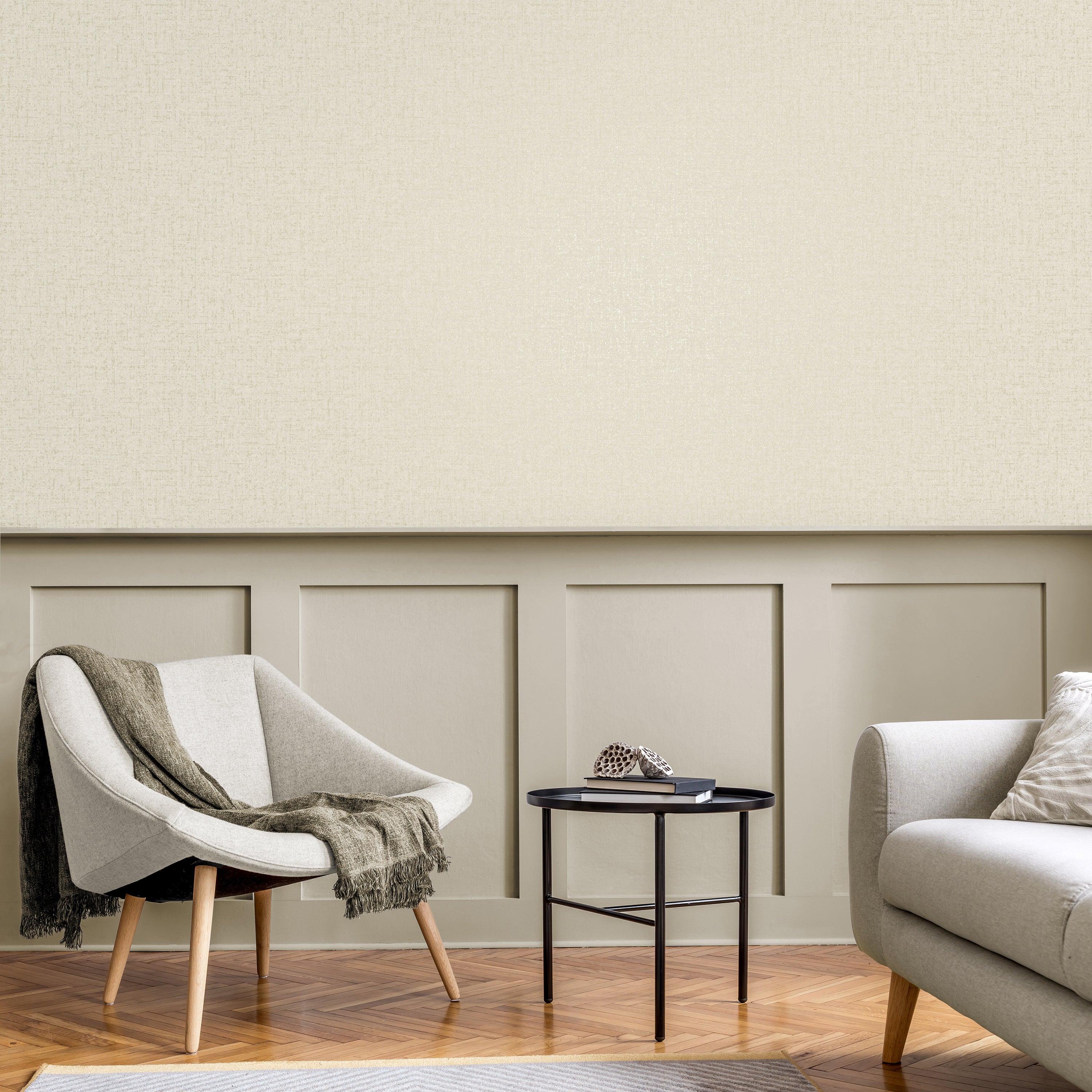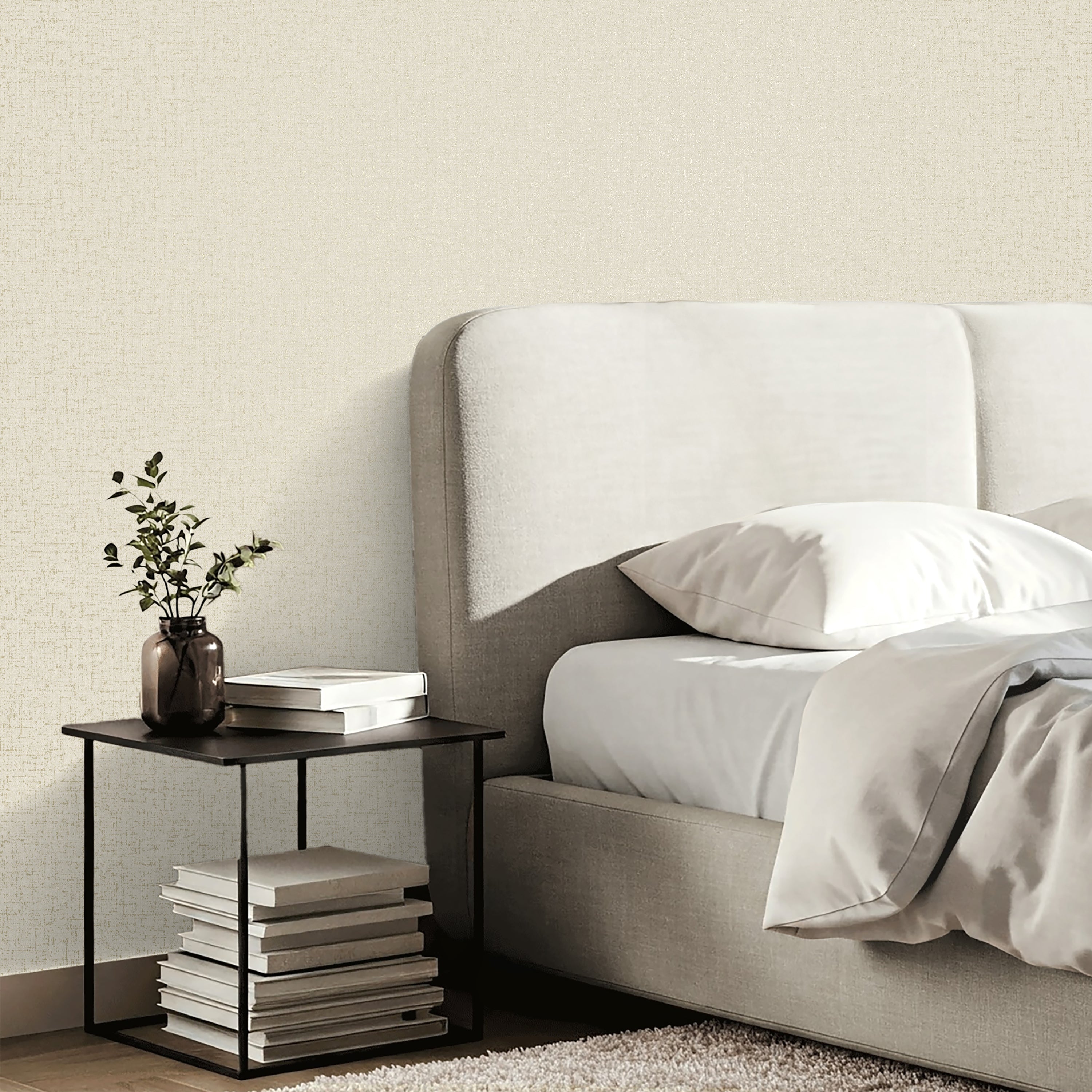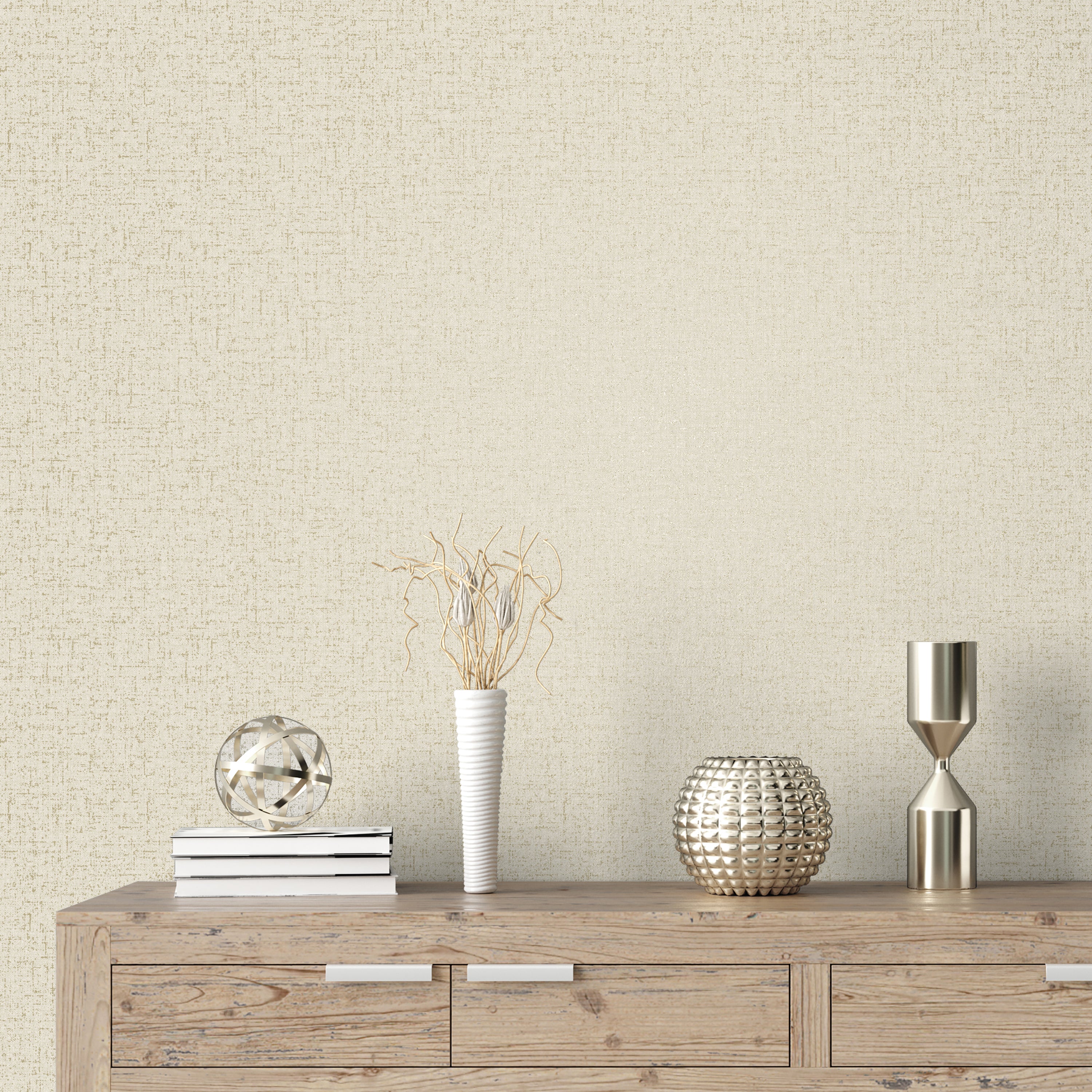 The gentle woven design gives the paper a tactile quality, creating depth and interest without stealing the spotlight. The warm neutral palette of cream and taupe has just a hint of shimmer, giving your walls a delicate glow that changes beautifully with the light. It’s subtle luxury done right — the kind of texture that adds charm without clutter.