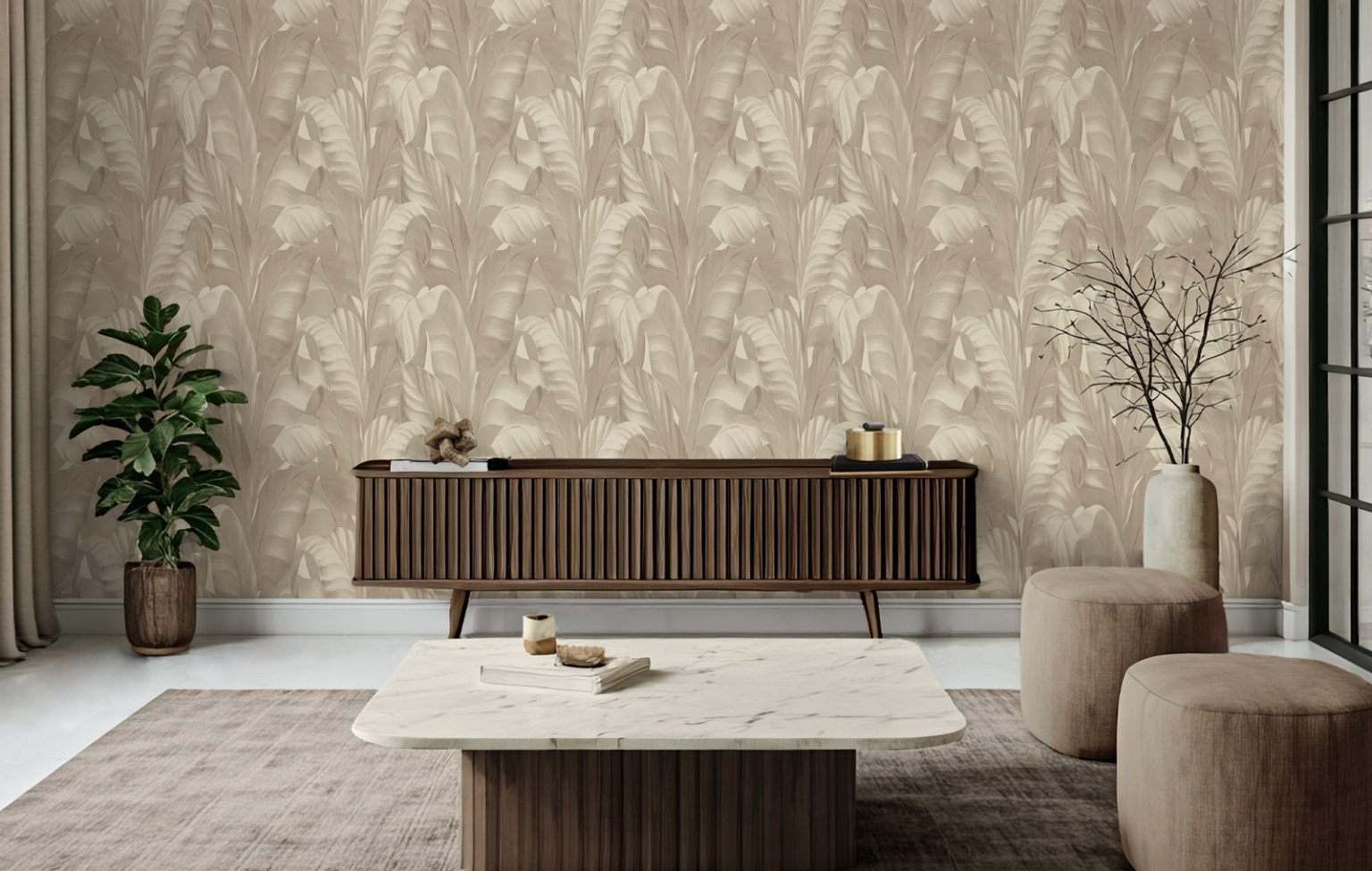 Large sweeping leaves cascade across the wall in layered formations, creating a sense of natural movement and texture. The colour palette blends warm beige, sandy taupe, soft cream and gentle stone tones, producing a sophisticated neutral wallpaper that feels both cosy and contemporary. It’s the kind of wallpaper that quietly transforms a room without demanding all the attention.