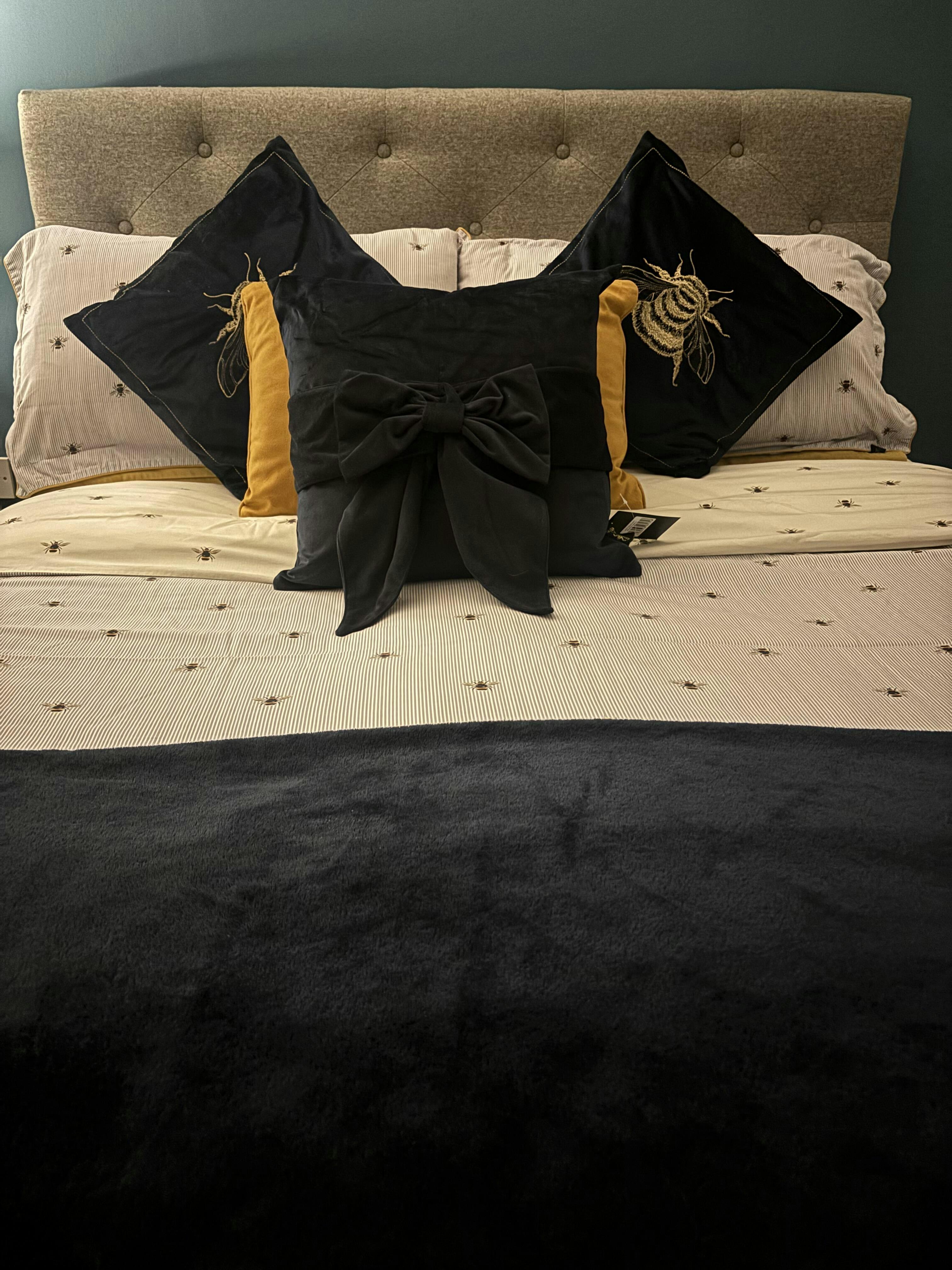 Unique & Beautiful: A navy velvet cushion that looks as sharp as a bow-tied dinner suit.